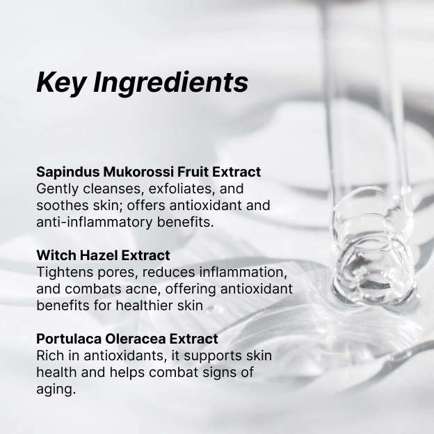 Enriched with the goodness of soapberries, this water-based formula washes away excess oil, leaving your skin feeling refreshed and rejuvenated. Perfect for oily skin types. Enriched with Sapindus Mukorossi Fruit Extract, commonly known as Soapberry, this cleanser offers gentle yet effective cleansing, removing impurities without stripping your skin of its natural oils. Witch Hazel Extract brings a touch of soothing magic, minimizing pores and balancing oil production, leaving your skin feeling refreshed and revitalized. Portulaca Oleracea Extract, also known as Purslane, lends its antioxidant properties to protect your skin from environmental stressors, promoting a healthy and radiant complexion.