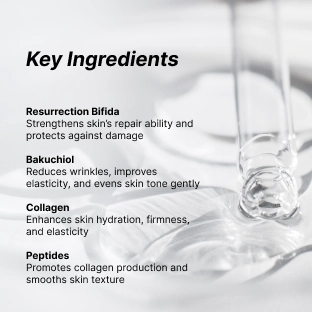 Water, Dipropylene Glycol, 1,2-Hexanediol, Glycereth-26, Niacinamide, Glycerin, Glyceryl Glucoside, Diphenyl Dimethicone, Triethylhexanoin, Butylene Glycol, Bifida Ferment Lysate, Selaginella Lepidophylla Extract, Hydrolyzed Collagen, Panthenol, Bakuchiol, Allantoin, Hydrogenated Lecithin, Hydroxyacetophenone, Dipotassium Glycyrrhizate, Polyglyceryl-10 Oleate, Carbomer, Arginine, Disodium EDTA, Caprylyl Glycol, Acetyl Hexapeptide-8