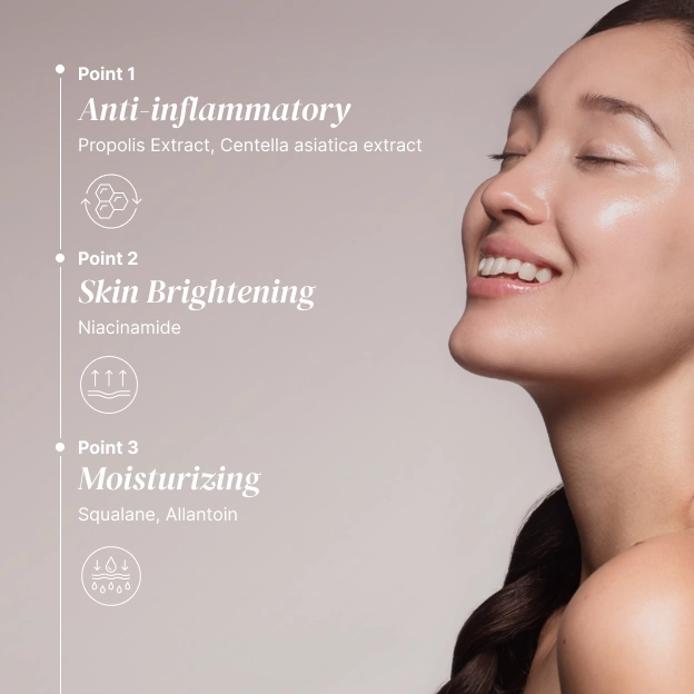 Water, Glycerin, Dipropylene Glycol, Cyclopentasiloxane, Dimethicone, 1,2-Hexanediol, Niacinamide , Squalane, Butylene Glycol, Propolis Extract, Centella Asiatica Extract, Hamamelis Virginiana (Witch Hazel) Water, Nelumbo Nucifera Flower water, Opuntia Ficus-Indica Extract, Beta-Glucan, Polyacrylate-13, Polyisobutene, Acrylates/C10-30 Alkyl Acrylate Crosspolymer , Ammonium Acryloyldimethyltaurate/VP Copolymer, Tromethamine, Xanthan Gum, Allantoin, Dipotassium Glycyrrhizate, Polysorbate 20, Dimethicone/Vinyl Dimethicone Crosspolymer, Adenosine, Sorbitan Isostearate, Sodium Hyaluronate, Fragrance
