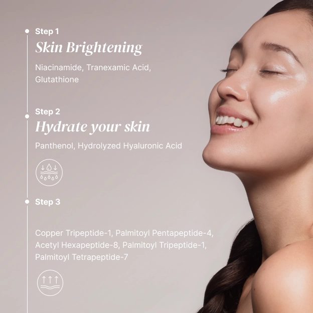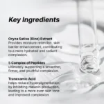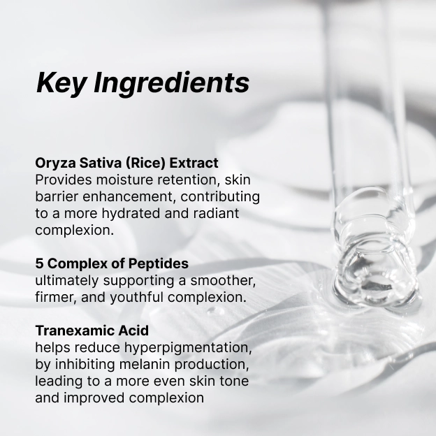 Water, Propanediol, Butylene Glycol, Glycerin, Niacinamide, 1,2-Hexanediol, Oryza Sativa (Rice) Seed Extract, Polyglyceryl-10 Laurate, Polyglyceryl-10 Myristate, Panthenol, Allantoin, Tranexamic Acid, Glutathione, Carbomer, Arginine, Ethylhexylglycerin, Pentylene Glycol, Sodium Hyaluronate, Sodium Hyaluronate Crosspolymer, Hydrolyzed Hyaluronic Acid, Copper Tripeptide-1, Hydrolyzed Sodium Hyaluronate, Hyaluronic Acid, Palmitoyl Pentapeptide-4, Hexapeptide-8, Palmitoyl Tripeptide-1, Palmitoyl Tetrapeptide-7