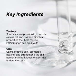 Water, Butylene Glycol, Glycerin, 1,2-Hexanediol, Niacinamide, Melaleuca Alternifolia (Tea Tree) Leaf Water, Melaleuca Alternifolia (Tea Tree) Extract, Centella Asiatica Extract, Allantoin, Panthenol, Glyceryl Acrylate/Acrylic Acid Copolymer, Sodium Hyaluronate, Adenosine, Madecassoside, Asiaticoside, Asiatic Acid, Madecassic Acid, Carbomer, Arginine